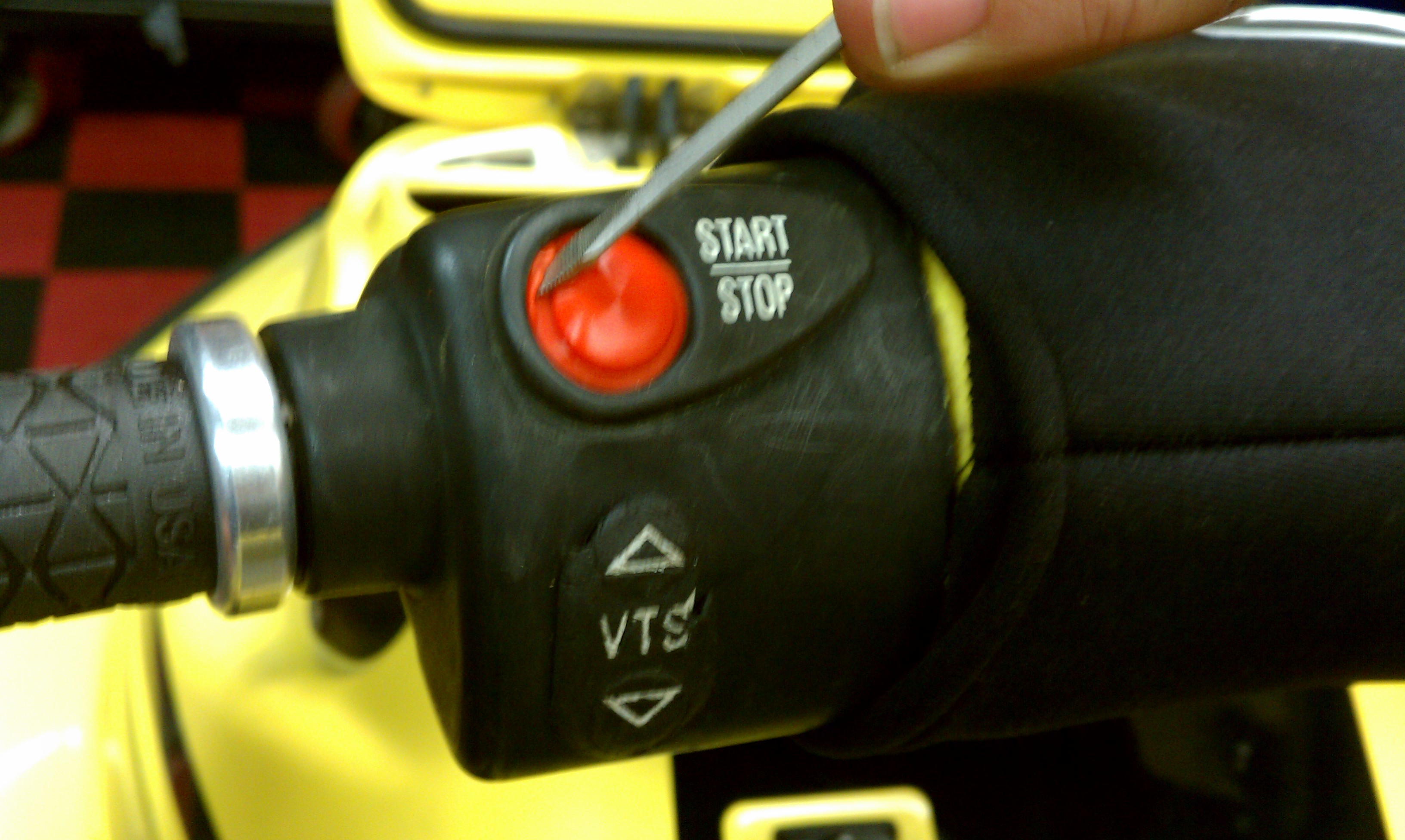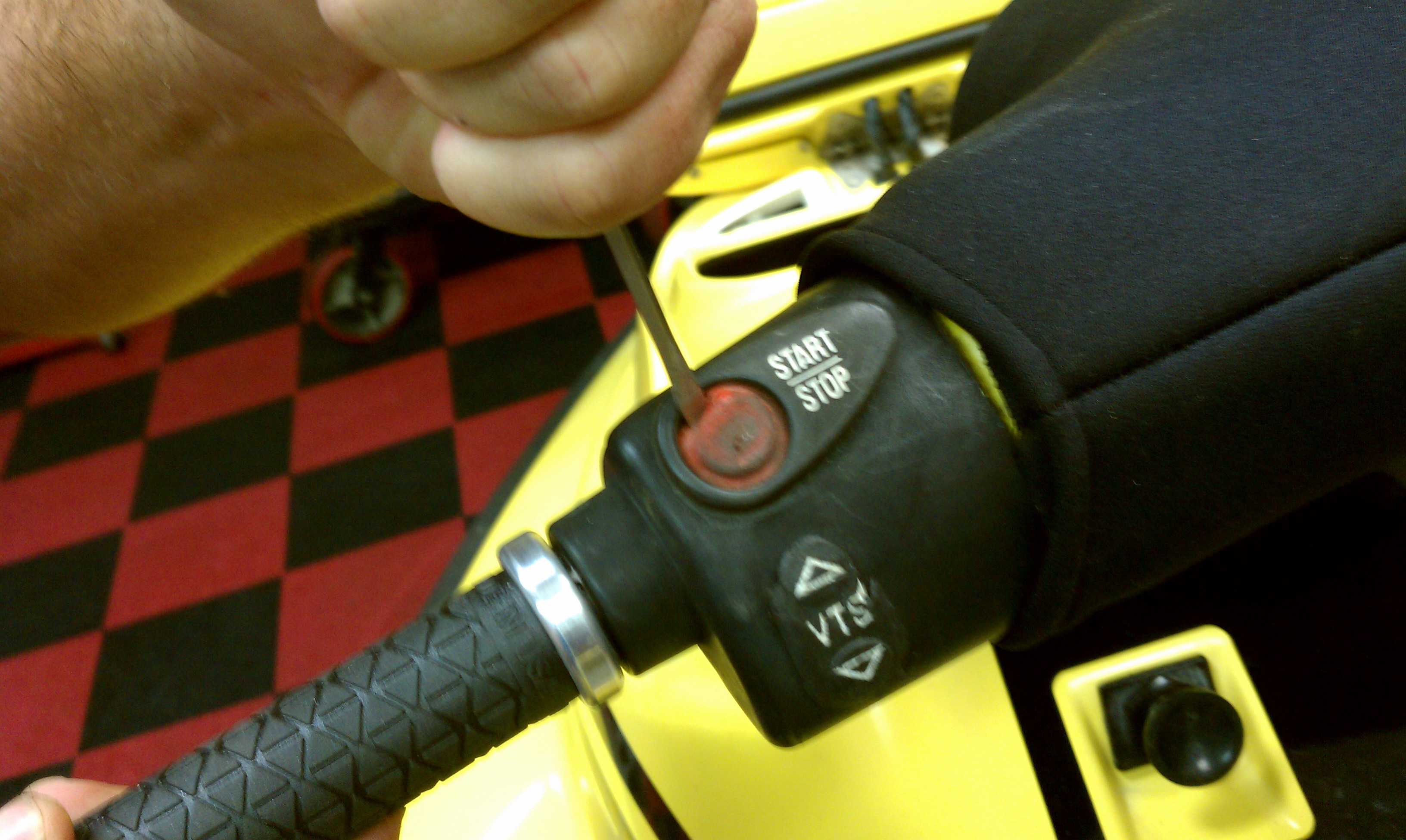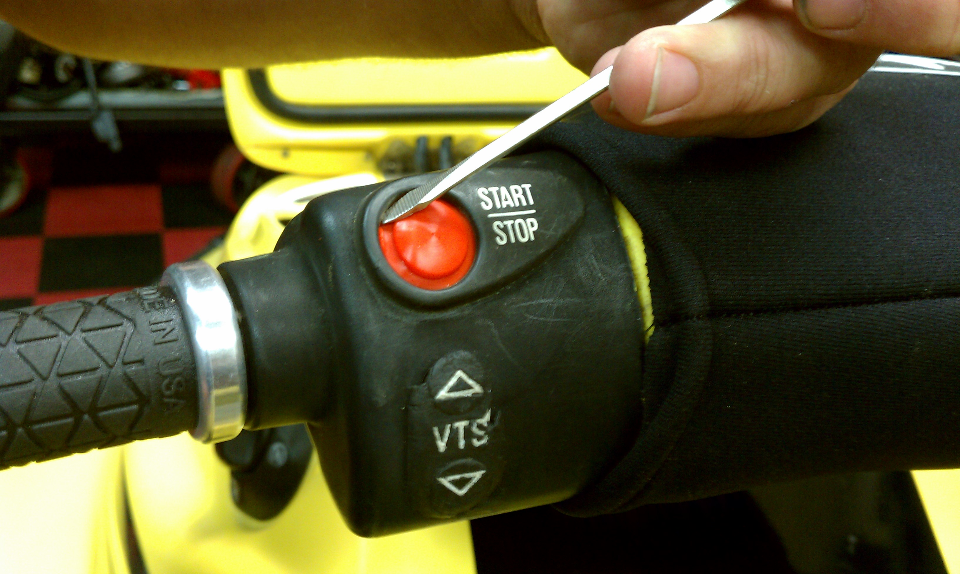 Using a small flat head screwdriver work the remains of the old red button cover out and clean the groove. Once all small parts of the old button are removed begin sliding in the new button cover, carefully work it into the groove with the same small screwdriver, tuck it in neatly and you’re done. SBT sells this button cover